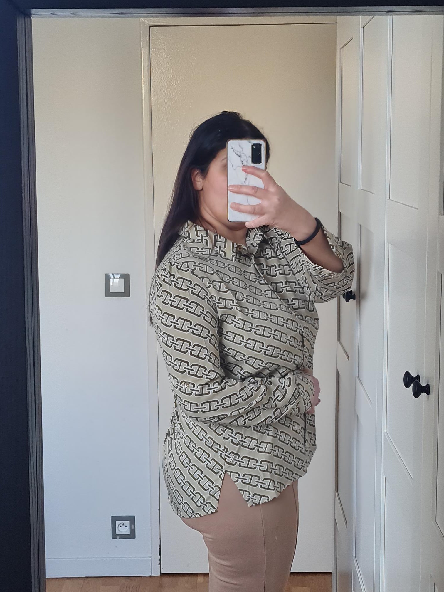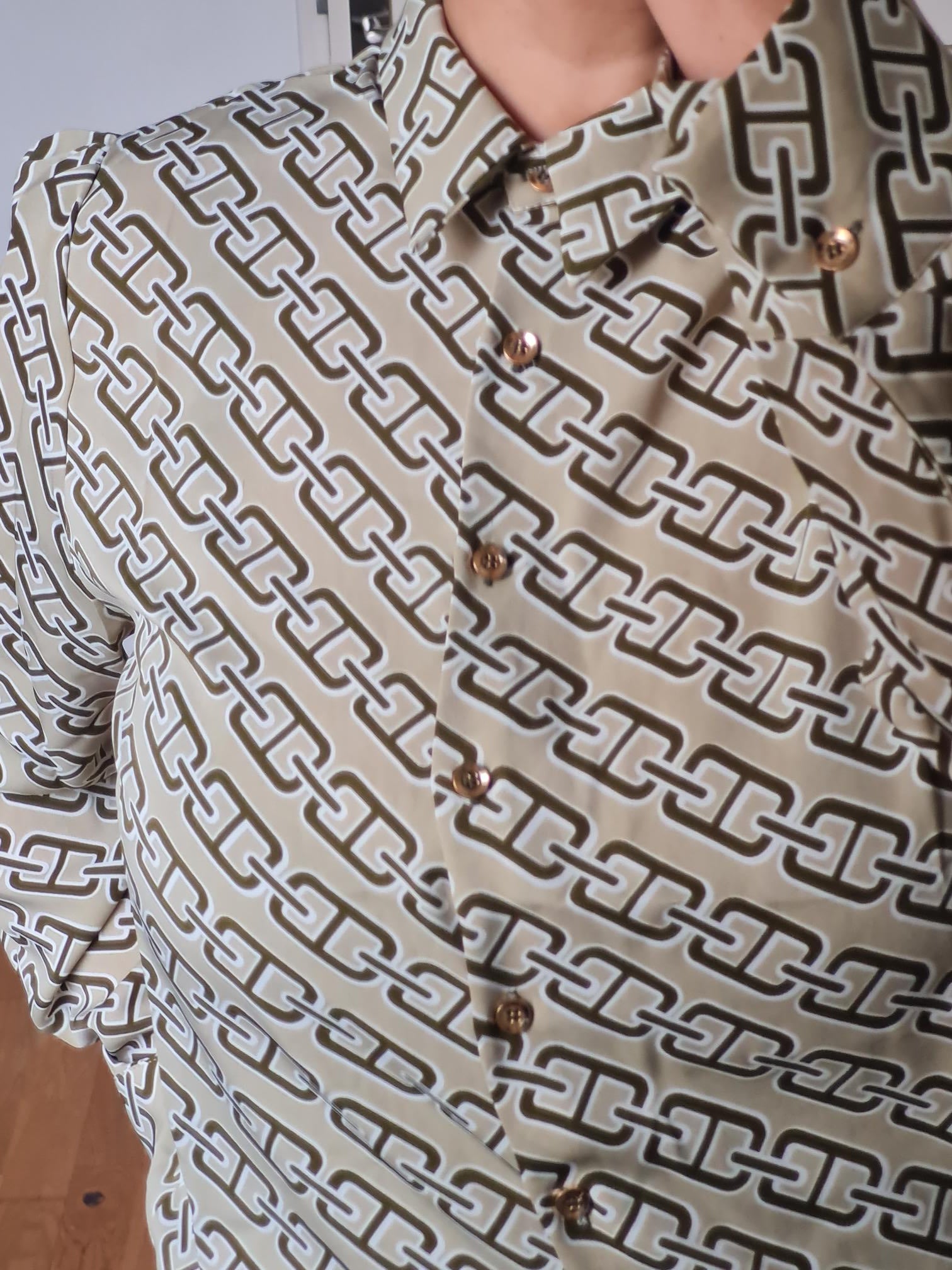 chemisier vert avec boutons dorés. Fluide et agréable. Idéal pour aller au travail ou pour la vie de tous les jours